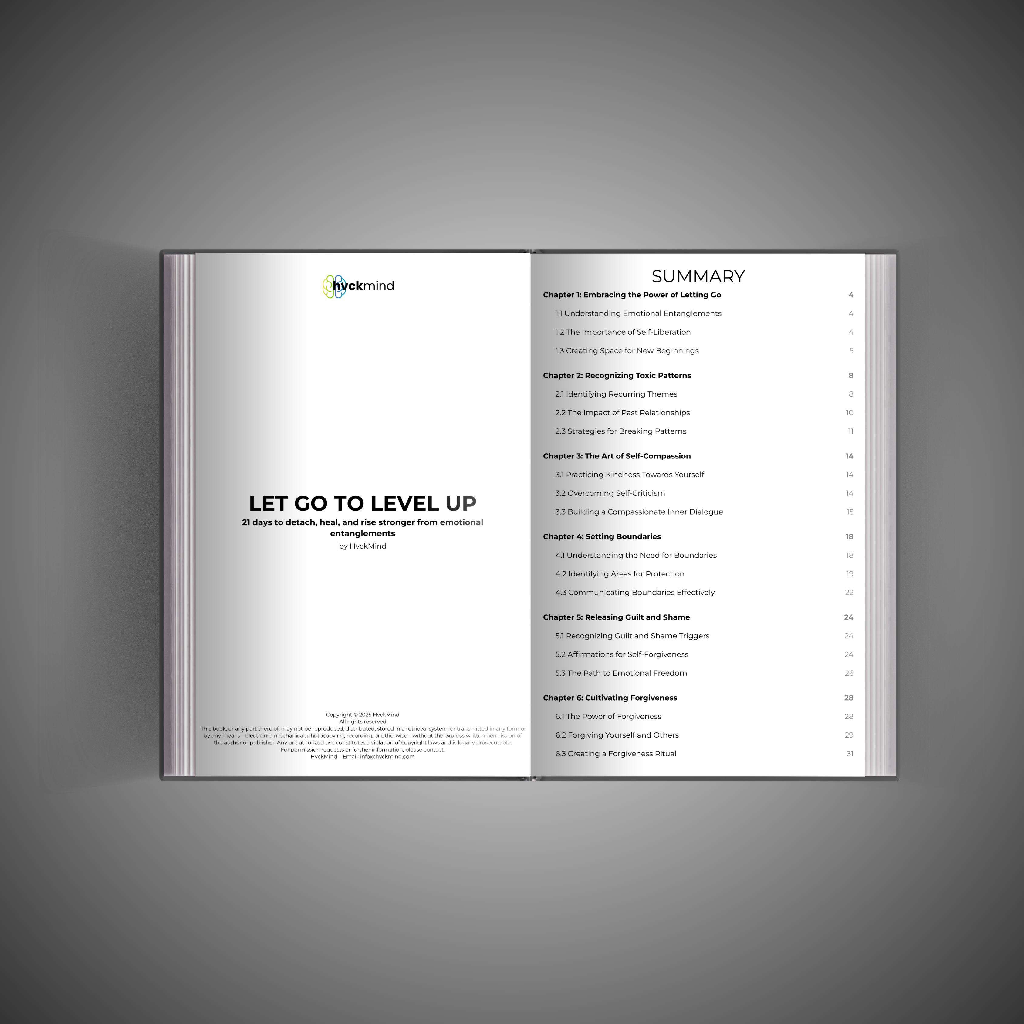 Let Go to Level Up is a complete, high-level digital guide designed to help you release emotional entanglements and rise stronger—starting from day one. With a clear 21-day structure, powerful reflections, and practical tools, it gently leads you through the process of detachment, healing, and inner renewal—step by step, with intention.